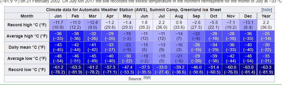 Am 2. Januar 2020 um 23:13 Uhr trat nun ein historischer Tiefstwert der Temperatur an der Wetterstation summit auf dem Grönländischen Inlandeis mit -65,9 Grad C (-86,8 F) auf, von dem nur spärlich Nachrichten verbreitet wurden.
